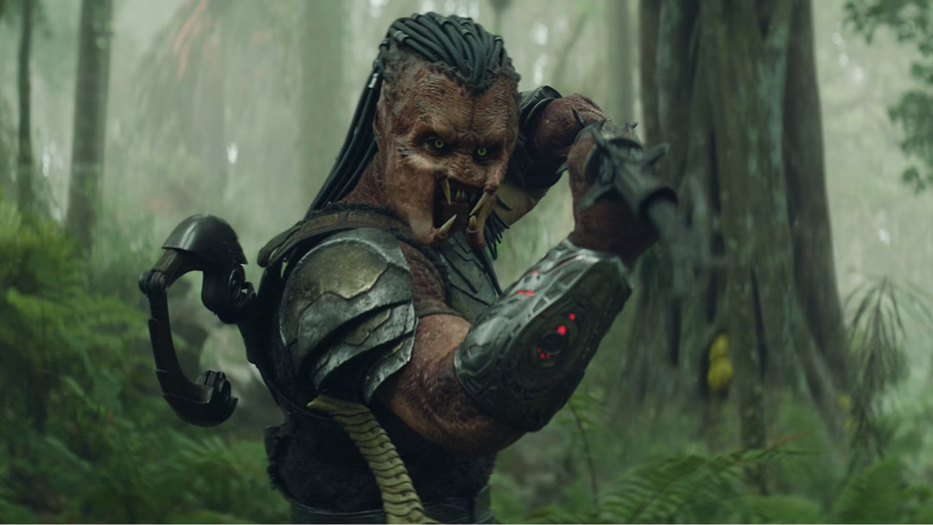 Como dito anteriormente, o novo filme se preocupa bem em apresentar a mitologia dos Yautjas e seus estilos de caça, especialmente quando o longa coloca seu protagonistas em situações de perigo, fazendo jus ao título de “Terras Selvagens” com ameaças vindo da fauna, flora e até mesmo de fontes externas , rendendo algumas das melhores cenas de luta apresentadas até agora na franquia, sem contar que o design de produção das criaturas é super bem trabalhado na riqueza de detalhes, enfatizando a todo momento o quão hostil é aquele planeta, assim como os efeitos visuais que estão impecáveis e contribuem para criar a tensão e perigo constante dos inimigos.