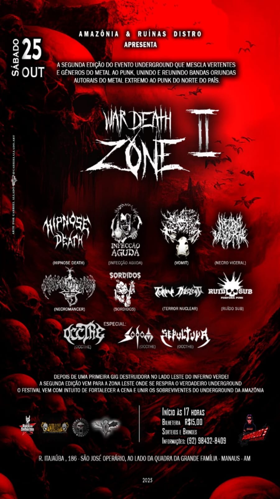 Neste dia 25, sábado é noite de muito Rock, Punk e Metal na Zona Leste de Manaus. O Local será a ADEGA dos PORRUDOS, que fica bem ao lado da Quadra da Grande Família. O evento contará com as apresentações das bandas Hipnose Death. Infeccção Aguda, Vomit, Necrovisceral, Necromancer, Sórdidos, Terror Nuclear, Ruído SUB, OCCTHE , que levará o Especial SODOM e SEPULTURA. Nos intervalos haverá a animação do DJ Jhon da Fita.